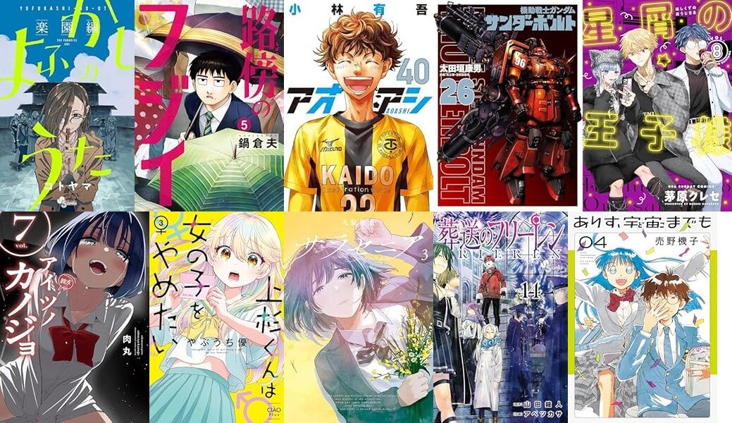 9月発売「よふかしのうた -楽園編-」は35%ポイント還元で、48%還元では「路傍のフジイ」「アオアシ」「機動戦士ガンダム サンダーボルト」「星屑の王子様」「アイツノカノジョ」「上杉くんは女の子をやめたい」「サラセニア」「葬送のフリーレン」「ありす、宇宙までも」「レジスタ!」「ミステリと言う勿れ」「もう興味がないと離婚された令嬢の意外と楽しい新生活」「BLUE GIANT MOMENTUM」など対象です。