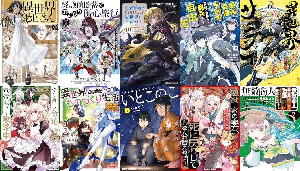 「異世界おじさん」「経験値貯蓄でのんびり傷心旅行」「勇者召喚に巻き込まれたけど、異世界は平和でした」「目覚めたら最強装備と宇宙船持ちだったので、一戸建て目指して傭兵として自由に生きたい」「異世界サムライ」「やり直し令嬢は竜帝陛下を攻略中」「異世界のすみっこで快適ものづくり生活」「いとこのこ」などなど。