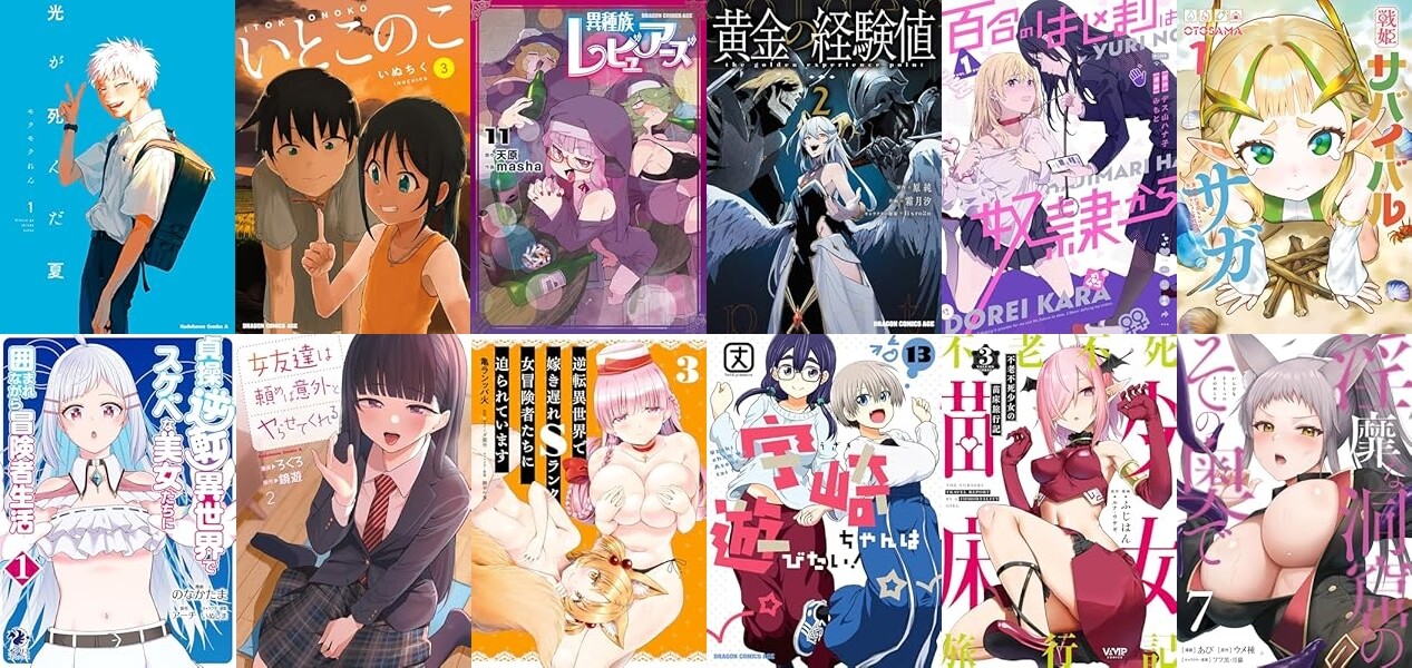 「光が死んだ夏」「いとこのこ」「異種族レビュアーズ」「黄金の経験値」「百合のはじまりは奴隷から」「戦姫サバイバルサガ」「貞操逆転異世界でスケベな美女たちに囲まれながら冒険者生活」「ダンジョン飯」「女友達は頼めば意外とヤらせてくれる」「逆転異世界で嫁き遅れSランク女冒険者たちに迫られています」「宇崎ちゃんは遊びたい!」「不老不死少女の苗床旅行記」「淫靡な洞窟のその奥で」「幼馴染は闇堕ち聖女!」「日常」「アイノセンビキ」「家が燃えて人生どうでも良くなったから、残ったなけなしの金でダークエルフの奴隷を買った。」など25作品をまとめました。