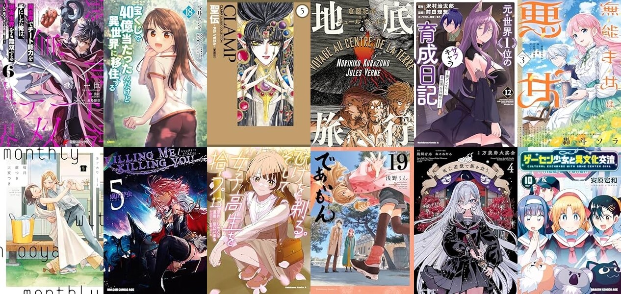 「異世界でチート能力を手にした俺は、現実世界をも無双する」「宝くじで40億当たったんだけど異世界に移住する」「聖伝-RG VEDA-」「地底旅行」「元・世界1位のサブキャラ育成日記」「無能才女は悪女になりたい」「毎月庭つき大家つき」「KILLING ME / KILLING YOU」「ひげを剃る。そして女子高生を拾う。」「であいもん」「死亡遊戯で飯を食う。」「ゲーセン少女と異文化交流」などなど。