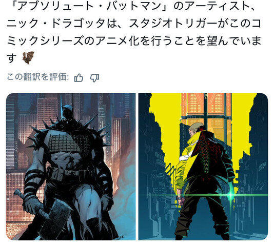 トリガーでバットマンをアニメ化して欲しい…! 2025/10/29 ねいろ速報さん " " 名前:ねいろ速報 名前:ねいろ速報 2 海外出資するならエッジランナーズクオリティにはなるだろう 名前:ねいろ速報 4 バットマンやるには彩度高すぎると思うんだよな DCだとフラッシュが一番似合うと思う 続きを読む Source: ねいろ速報さん