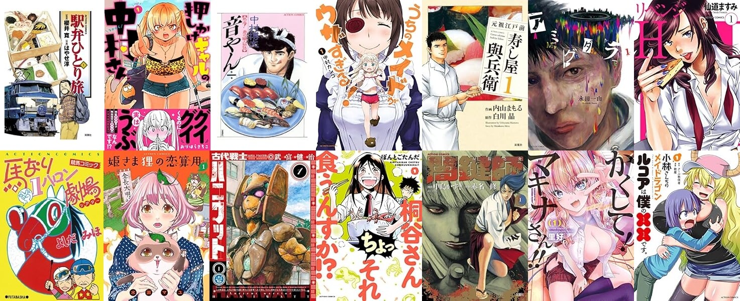 「駅弁ひとり旅」「押しかけギャルの中村さん」「音やん」「うちのメイドがウザすぎる!」「元祖江戸前 寿し屋與兵衛」「アミグダラ」「リベンジH」「馬なり1ハロン劇場」「姫さま狸の恋算用」「古代戦士ハニワット」「桐谷さん ちょっそれ食うんすか!?」「闇鍵師」「かくして!マキナさん!!(フルカラー)」「小林さんちのメイドラゴン ルコアは僕の××です。」「監禁嬢」「鉄人マコちゃん」「きんぱつへきがん 関西版」「王様ゲーム」「乙女戦争 ディーヴチー・ヴァールカ」など40作品以上をまとめました。