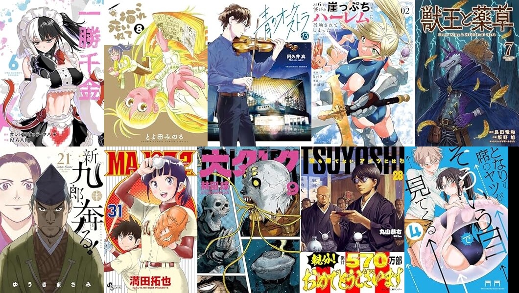 「一勝千金」「これ描いて死ね」「青のオーケストラ」「あと6日で滅びる崖っぷち国家のハーレムに召喚されてしまった」「獣王と薬草」「新九郎、奔る!」「MAJOR 2nd」「大ダーク」「TSUYOSHI 誰も勝てない、アイツには」「となりの席のヤツがそういう目で見てくる」「巻き添えで異世界に喚び出されたので、世界観無視して和菓子作ります」「トニカクカワイイ」「写らナイんです」「ロードマギアの弟子」「お嬢様系底辺ダンジョン配信者、迷惑系をボコったらバズって伝説になってますわ!?」「ブルーウルスス」などなど。