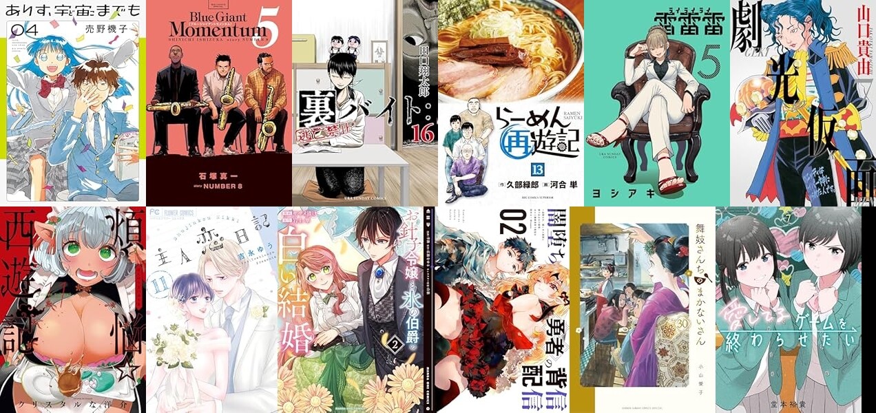 「ありす、宇宙までも」「BLUE GIANT MOMENTUM」「裏バイト:逃亡禁止」「らーめん再遊記」「雷雷雷」「劇光仮面」「煩悩☆西遊記」「主人恋日記」「お針子令嬢と氷の伯爵の白い結婚」「闇堕ち勇者の背信配信」「舞妓さんちのまかないさん」「愛でて春」「愛してるゲームを終わらせたい」「ドラゴン養ってください」「デストロ016」