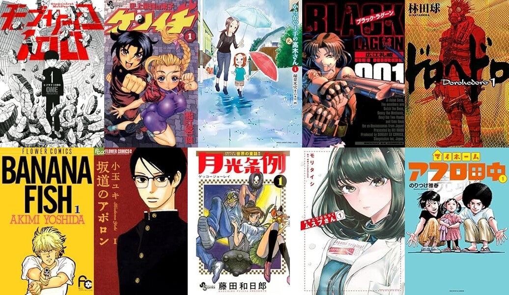 「モブサイコ100」「史上最強の弟子ケンイチ」「からかい上手の(元)高木さん」「ブラック・ラグーン」「ドロヘドロ」「BANANA FISH」「坂道のアポロン」「月光条例」「あそこではたらくムスブさん」「マイホームアフロ田中」「新装版 動物のお医者さん」「信長協奏曲」「おやすみプンプン」「BASARA」「ギャラリーフェイク」「マギ」「ヨルムンガンド」などなど。