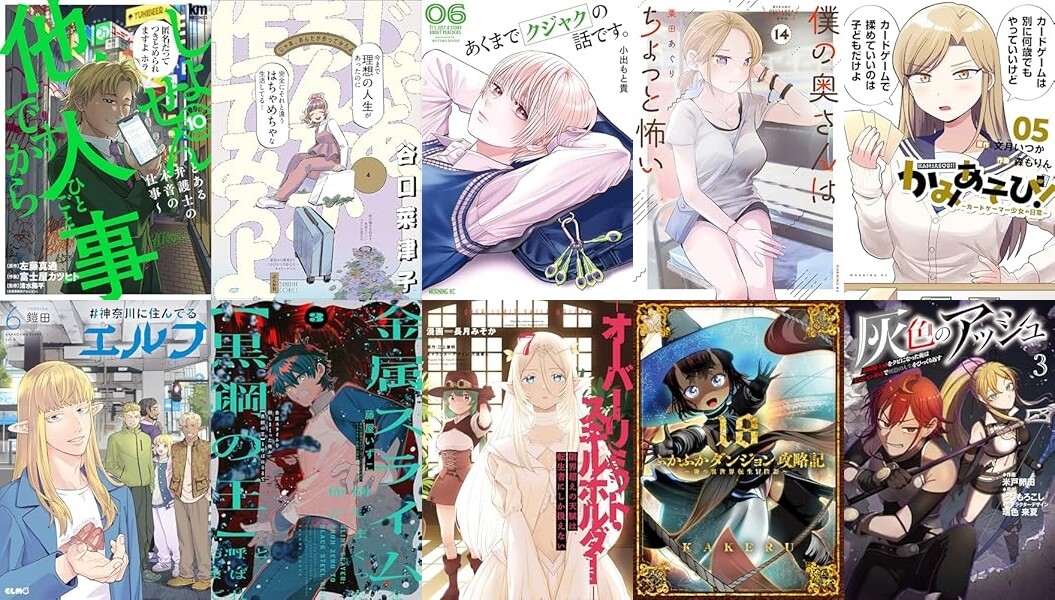 白泉社「しょせん他人事ですから10」など、ぶんか社「じゃあ、あんたが作ってみろよ (4)」、講談社「あくまでクジャクの話です。(6)」「僕の奥さんはちょっと怖い(14)」「かみあそび!~カードゲーマー少女の日常~(5)」「夫の遺言が『同人誌描け』だったもので(3)」など、マイクロマガジン社「#神奈川に住んでるエルフ 6」など発売。