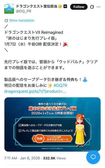 ドラクエ7の体験版、水曜0時配信開始! 2026/1/6 ねいろ速報さん " " 1: ねいろ速報 シリーズ最高傑作なんだが? 11: ねいろ速報 神父さまのストーリーは残ってるのだろうか 13: ねいろ速報 1番めんどい導入部を体験版で消化させるのは英断だな 続きを読む Source: ねいろ速報さん