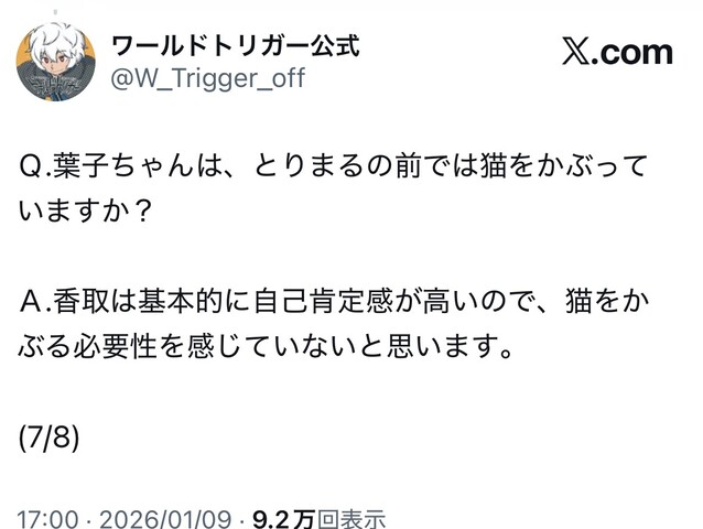 【ワールドトリガー】Q「香取は鳥丸の前で猫被ってますか?」 2026/1/10 ねいろ速報さん " " 名前:ねいろ速報 香取お前… 【ワールドトリガー】葦原大介 集英社 名前:ねいろ速報 1 木虎も見習った方がいいと思う 名前:ねいろ速報 2 とりまるみたいなモテ男には最適解かも 続きを読む Source: ねいろ速報さん