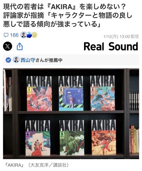 AKIRAは当時からよくわからなかった…! 2026/1/13 ねいろ速報さん " " 名前:ねいろ速報 名前:ねいろ速報 2 映像凄いよね…内容わかんね… 名前:ねいろ速報 3 当時から全然わからなかったけど何かパワーは感じた 続きを読む Source: ねいろ速報さん