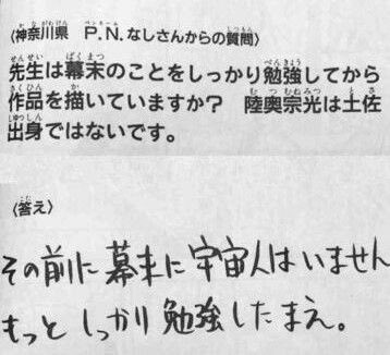 読者「陸奥宗光は土佐出身じゃない。ちゃんと幕末の勉強して!」銀魂作者「!!!」 2026/1/14 ジャンプ速報 " " 1: 風吹けば名無し 2026/01/12(月) 20:06:13.92 ID:aRm82UCM0 2: 風吹けば名無し 2026/01/12(月) 20:08:20.53 ID:O6jtk0Y+0 幕末に宇宙人いたかもしれへんやろ 4: 風吹けば名無し 2026/01/12(月) 20:09:31.66 ID:DjZ2uZ4U0 今はいるという風潮 続きを読む Source: ジャンプ速報