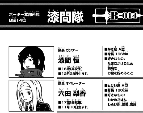 ワールドトリガーの漆間隊www 2026/1/24 ねいろ速報さん " " 名前:ねいろ速報 この先どう転んでもおいしい部隊だよね 【ワールドトリガー】葦原大介 集英社 名前:ねいろ速報 1 漆間恒(16) 六田梨香(17) おお 名前:ねいろ速報 2 名前が出たときから大人気なのが笑うよね漆間隊長 続きを読む Source: ねいろ速報さん