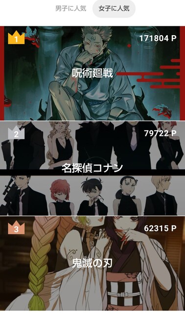 今女性に人気の作品! 1位「呪術廻戦」2位「名探偵コナン」3位「鬼滅の刃」 2021/5/9 ねいろ速報さん " " 1: ねいろ速報 どう?異論ある? 9: ねいろ速報 >>1 どこがコナンやねん 3: ねいろ速報 そら異論はないやろ 続きを読む Source: ねいろ速報さん