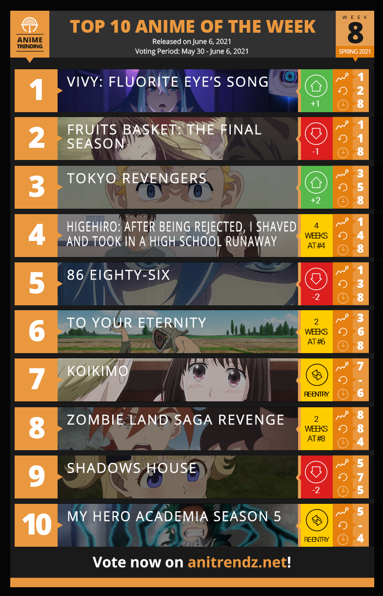 海外アニメサイトにて、2021年春アニメランキングが発表されています(5月5週目)。Anime Cornerでは、1位に「Vivy -Fluorite Eye’s Song-」、2位に「フルーツバスケット The Final」、3位に「86―エイティシックス―」、4位に「僕のヒーローアカデミア 第5期」、5位に「