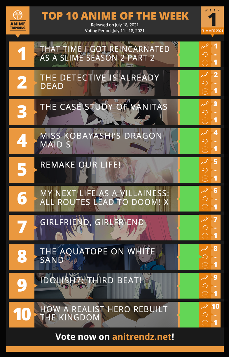 そしてAnime Trendingでは、第1位に選ばれたのは「転生したらスライムだった件 第2期第2部」、第2位は「探偵はもう、死んでいる。」、第3位は「ヴァニタスの手記」。