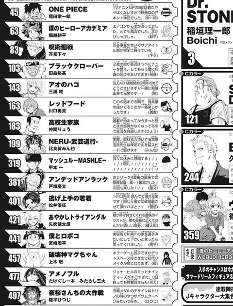 少年ジャンプ、ヤバい 2021/8/10 ねいろ速報さん " " 1: ねいろ速報 打ち切り間近の作品が多い一方ジャンプはロボ子マグ夜桜アメの打ち切りサバイバルがスタートした模様 2: ねいろ速報 夜桜って第二のスパイファミリーになるんじゃなかったっけ? 5: ねいろ速報 連載2年いってな漫画ばっかりやろ 続きを読む Source: ねいろ速報さん