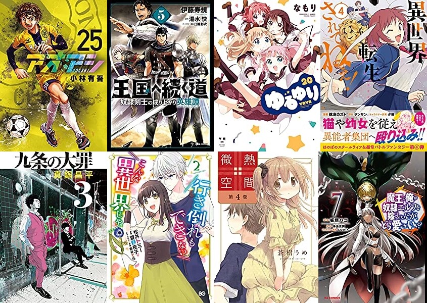 集英社より「怪獣8号 4巻」「ルックバック」「姫様“拷問”の時間です 7巻」、小学館「アオアシ 25巻」「九条の大罪 3巻」「夏目アラタの結婚 6巻」「GIGANT 9巻」「正直不動産 12巻」など、KADOKAWAより「王国へ続く道 奴隷剣士の成り上がり英雄譚 5巻」「ある日、お姫様になってしまった件について 5巻」など発売。